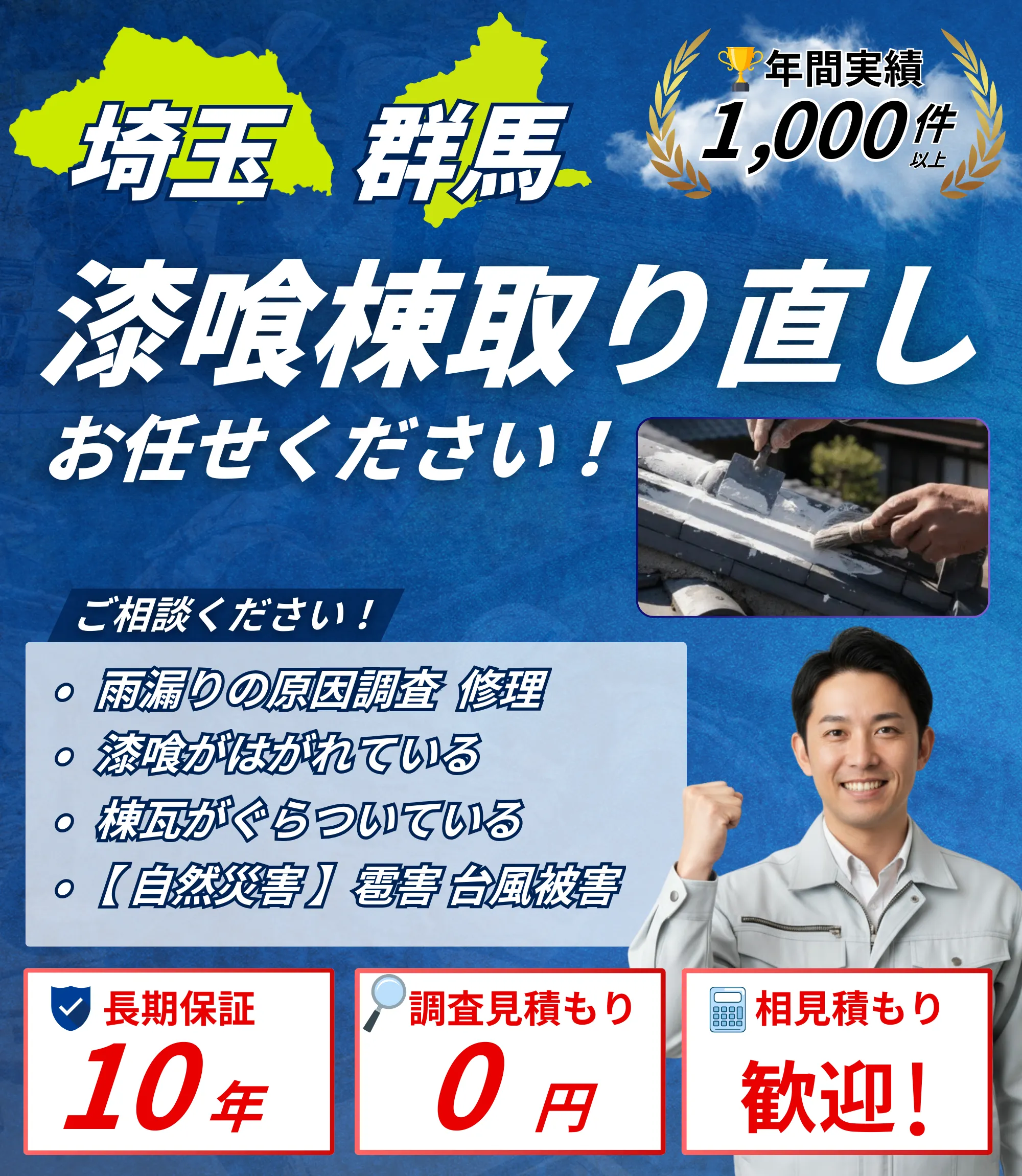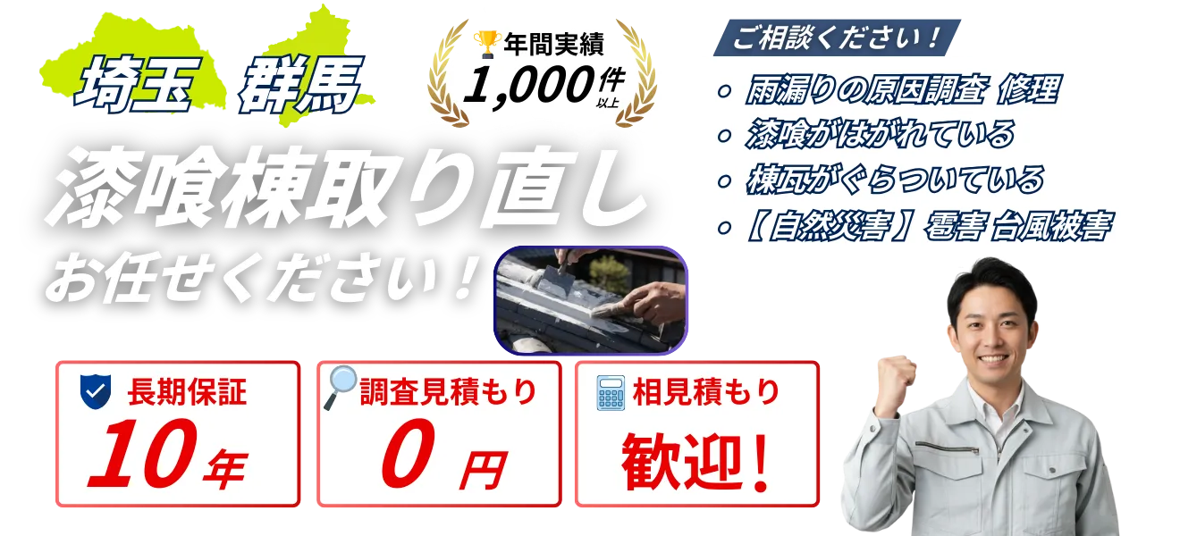一般的に10〜20年が補修の目安です。剥がれている、黒ずんでいる、棟瓦がぐらついているなどの症状が出たら、早めの補修をおすすめします。現地調査・お見積もりは無料です。